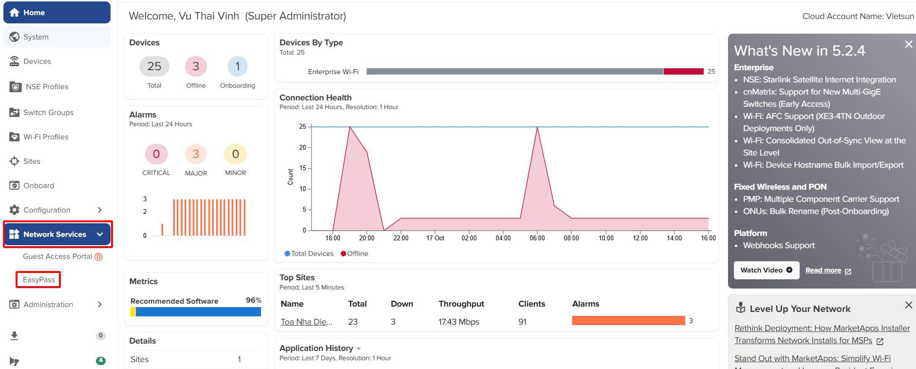 Đầu tiên tại trang quản trị của cnMaestro các bạn vào mục Network Services chọn EasyPass