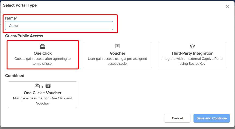 Tiếp theo, các bạn tiến hành đặt tên cho Portal và chọn phương thức truy cập phù hợp với mô hình WiFi marketing của mình.