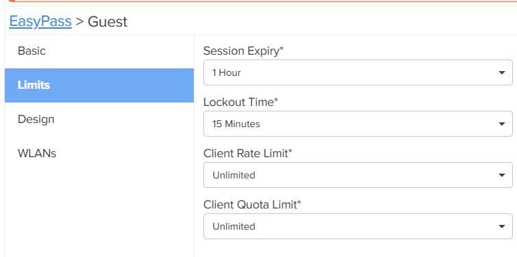 Tại tab Limits, bạn có thể thiết lập các thông số kiểm soát thời gian và băng thông truy cập cho người dùng WiFi marketing.
