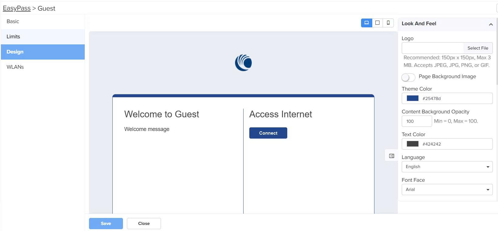 Tiếp theo, chúng ta chuyển sang tab Design để tùy chỉnh giao diện trang chào (Welcome Page) mà người dùng sẽ nhìn thấy khi kết nối WiFi.