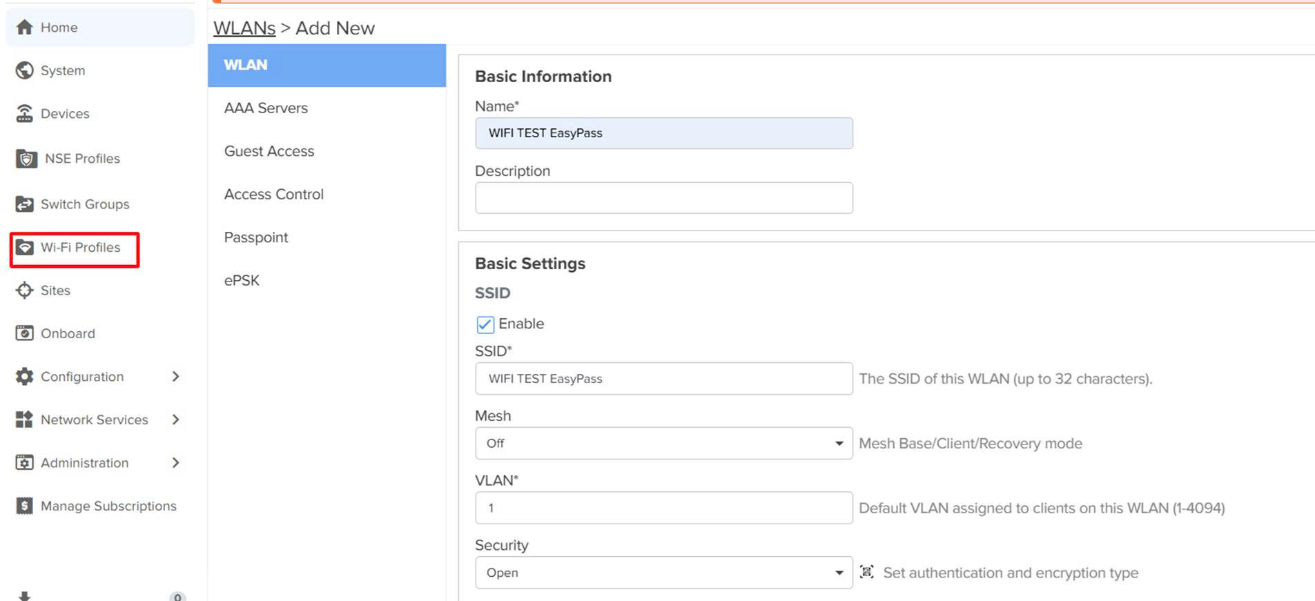 Tiếp theo các bạn sẽ cần tạo WLAN để sử dụng cho Portal này bằng cách tại mục WiFi-Profiles các bạn chọn WLANs, bấm Add New và điền các thông tin cơ bản như SSID, Password,…