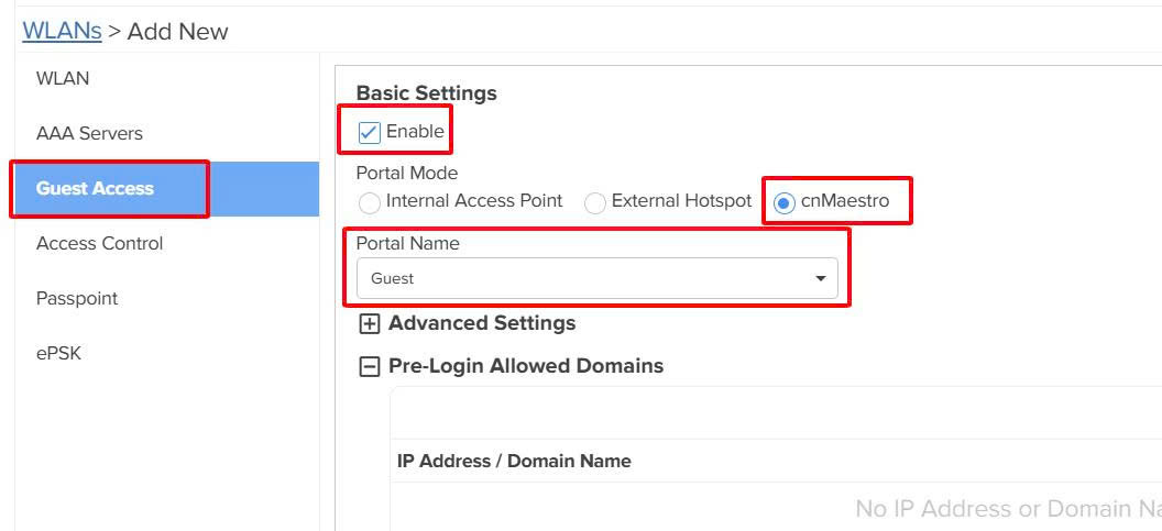Tiếp theo ở mục Guest Access các bạn Enable, phần Portal Mode sẽ chọn cnMaestro , Portal Name sẽ chọn đúng portal mà đã tạo ở trên