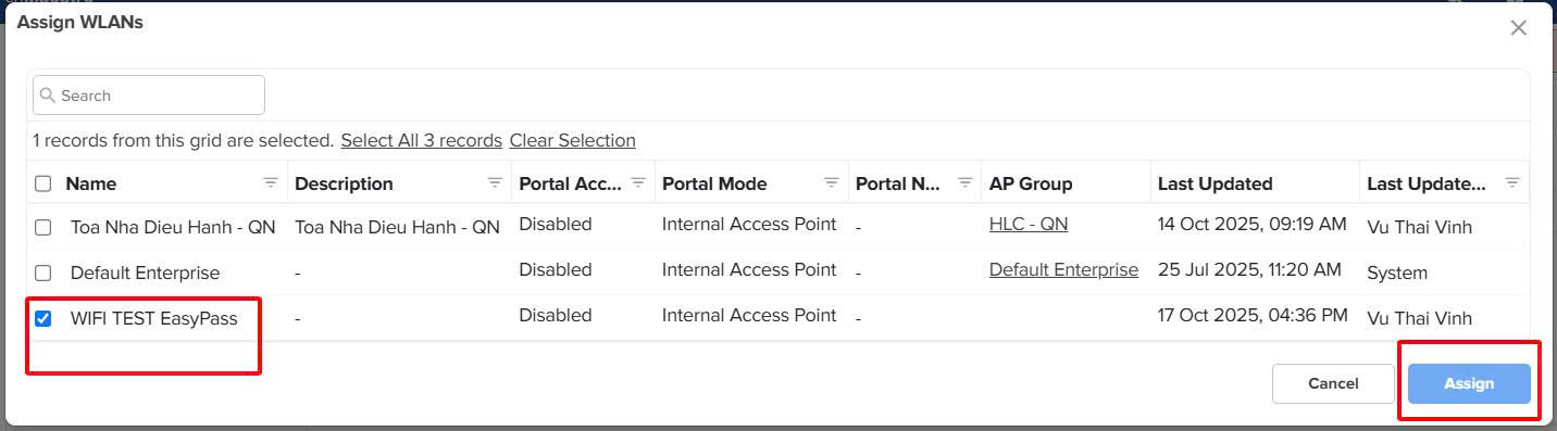 Nhấn Assign WLANs, sau đó chọn WiFi (SSID) tương ứng trong danh sách mà bạn đã khởi tạo trước đó.