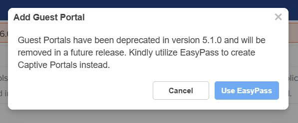 Trước đây, chúng ta thường triển khai trang chào WiFi Marketing trên Cambium thông qua Guest Access Portal. Tuy nhiên, kể từ phiên bản cnMaestro 5.1.0, tính năng Guest Access Portal đã bị loại bỏ và sẽ chính thức xóa bỏ trong các bản phát hành sắp tới cho nên trong giao diện cấu hình bạn vẫn sẽ thấy mục Guest Access Portal nhưng ấn vào sẽ có thông báo như ảnh bên dưới.