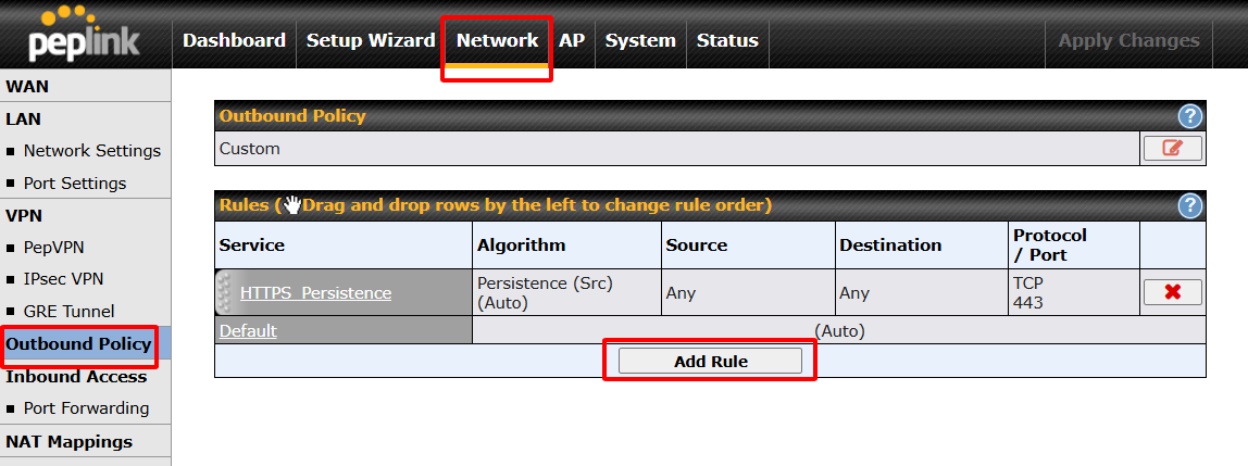 Tiếp theo chúng ta sẽ cân bằng tải 2 đường WAN này bằng cách các bạn vào mục Network --> Outbound Policy --> Add Rule