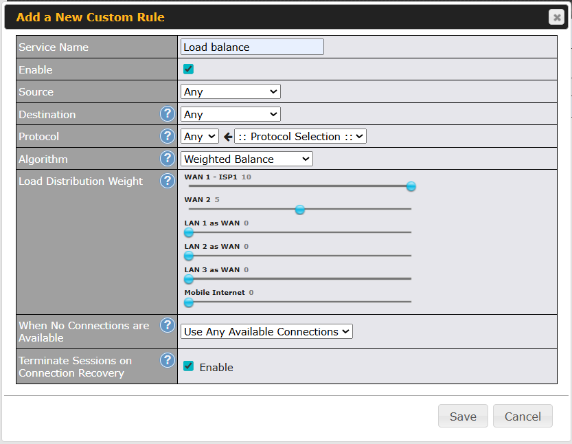 - Terminate Sessions on Connection Recovery: tích Enable để dữ lệu sẽ cân bằng tải lại 2 WAN như cũ khi WAN down ban nãy đã up trở lại