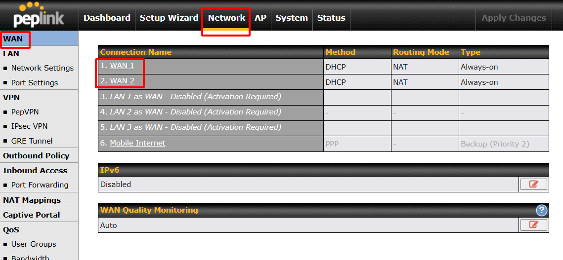 Tiếp theo đến phần cấu hình WAN, các bạn vào mục Network --> WAN và chọn từng WAN để cấu hình.