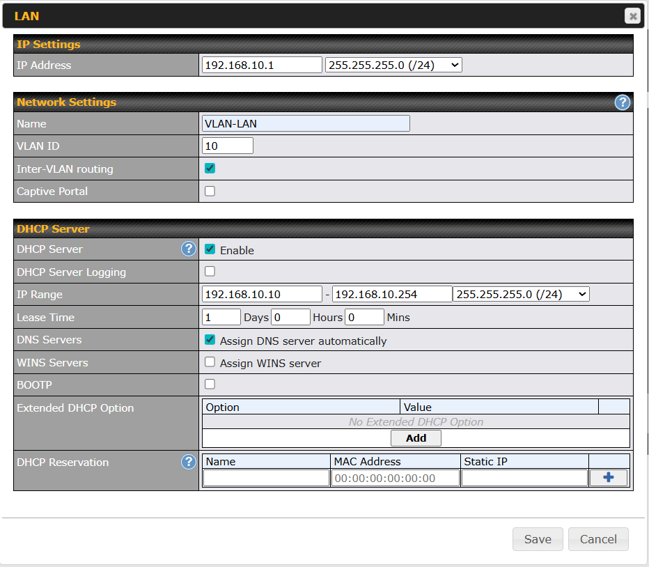 Trong cửa sổ LAN, các bạn điền các thông số cần thiết như địa chỉ IP, tên VLAN, VLAN ID, enable DHCP Server, IP range sau đó ấn Save để lưu lại.