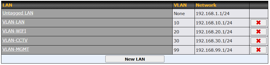 Tiếp theo đến phần cấu hình LAN, phần này mình sẽ khởi tạo các VLAN , cấp DHCP theo quy hoạch. Các bạn vào mục Network --> LAN --> Network Settings và bấm vào New LAN