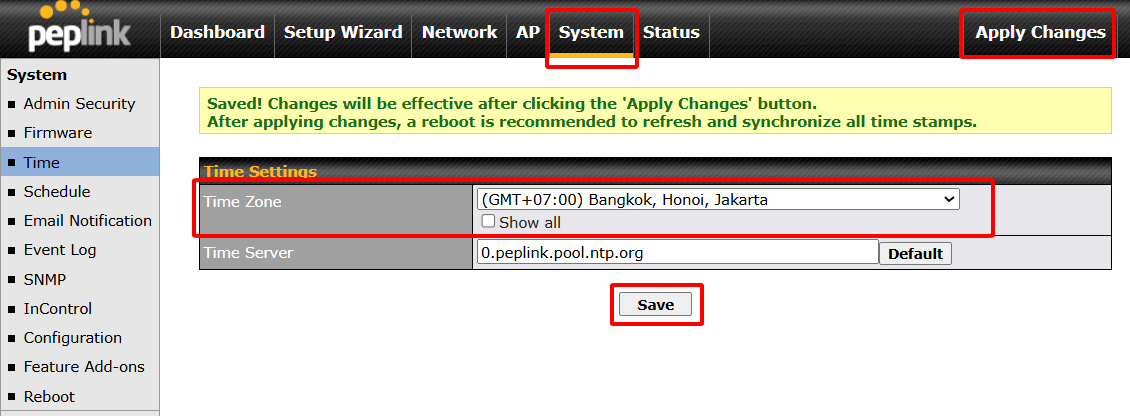 Sau đó các bạn cài đặt Timezone cho thiết bị, vào mục System --> Time --> chọn time zone --> ấn Save --> Apply Changes --> Confirm để lưu lại.