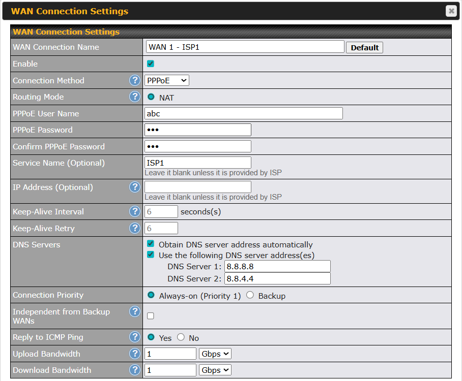 - Connection Priority: Các bạn sẽ chỉ định đường WAN chính và đường backup nếu muốn chạy theo kiểu failover, trong ví dụ này mình sẽ cân bằng tải 2 WAN nên sẽ chọn cả 2 là Always-on (Priority 1)