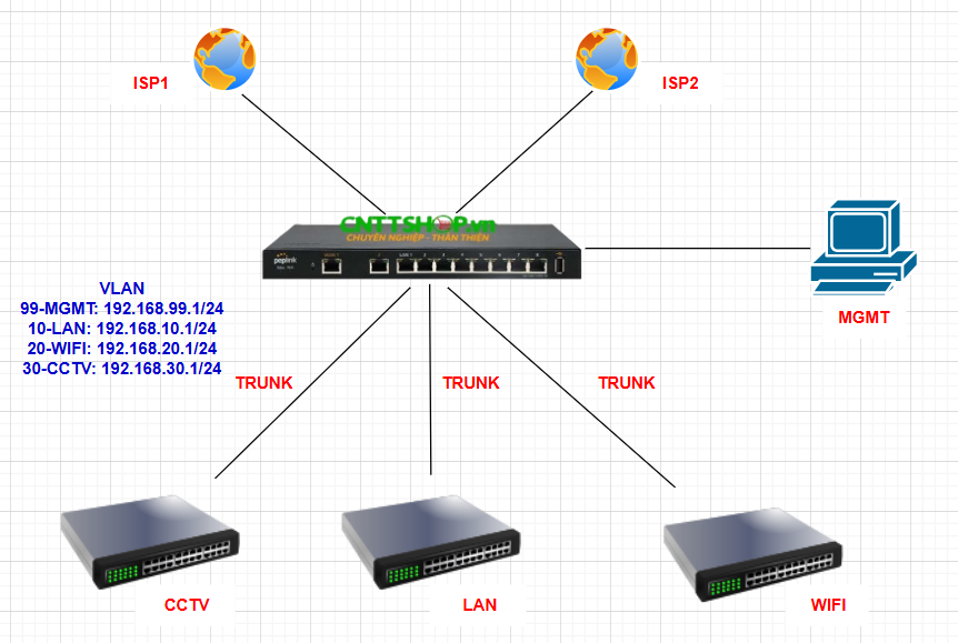 Như vậy là mình đã hướng dẫn xong phần cấu hình cơ bản WAN-LAN trên Cân bằng tải Peplink , các bạn có thể cắm các switch bên dưới để cấu hình và test dịch vụ. Các tính năng khác chúng mình sẽ liên tục update trên website của CNTT Shop, các bạn có thể search đọc và tham khảo. Chúc các bạn thành công!