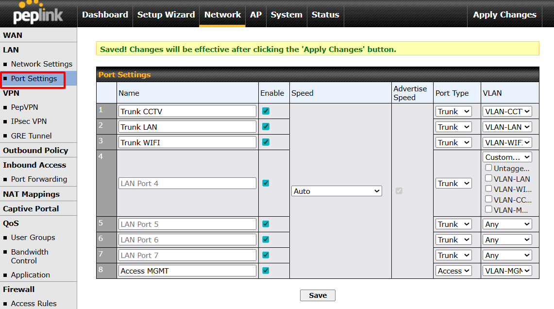 Tiếp theo để chỉ định các cổng cụ thể sẽ Trunk/Access vlan nào các bạn chọn mục Port Settings bên dưới và cấu hình các Port Type theo mô hình, trường hợp các bạn muốn Trunk toàn bộ vlan qua 1 cổng nào đó thì mục VLAN sẽ chọn Any, nếu muốn trunk vài vlan chỉ định thì chọn Custom và chọn các VLAN đó, sau cùng ấn Save và Apply Changes để lưu lại toàn bộ cấu hình.