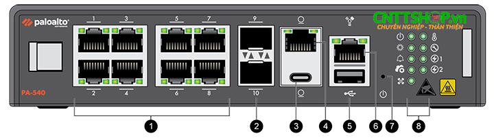 Palo Alto PA-540 được trang bị 8 cổng RJ45 1G và 2 cổng SFP 1G, cùng với 1 cổng quản lý OOBM Gigabit, 1 cổng USB, 1 cổng Console RJ45 và 1 cổng Console USB-C. Thiết bị có dung lượng lưu trữ 120 GB, tích hợp Trusted Platform Module (TPM) nhằm bảo vệ khóa mã hóa và đảm bảo khởi động an toàn. Công suất tiêu thụ tối đa chỉ 30W, hoạt động với nguồn điện 100–240VAC, 50–60Hz, hỗ trợ làm mát thụ động, đảm bảo hoạt động êm ái và tiết kiệm năng lượng.